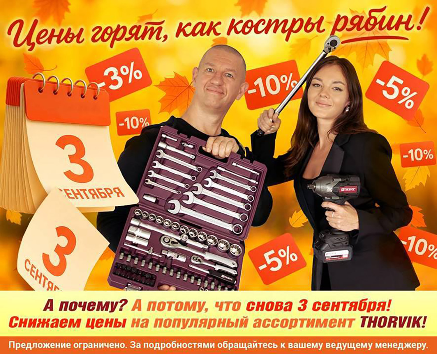 На наборы, отвертки, аккумуляторные гайковерты Thorvik, а также динамометрические ключи установлено снижение на 5-10%.