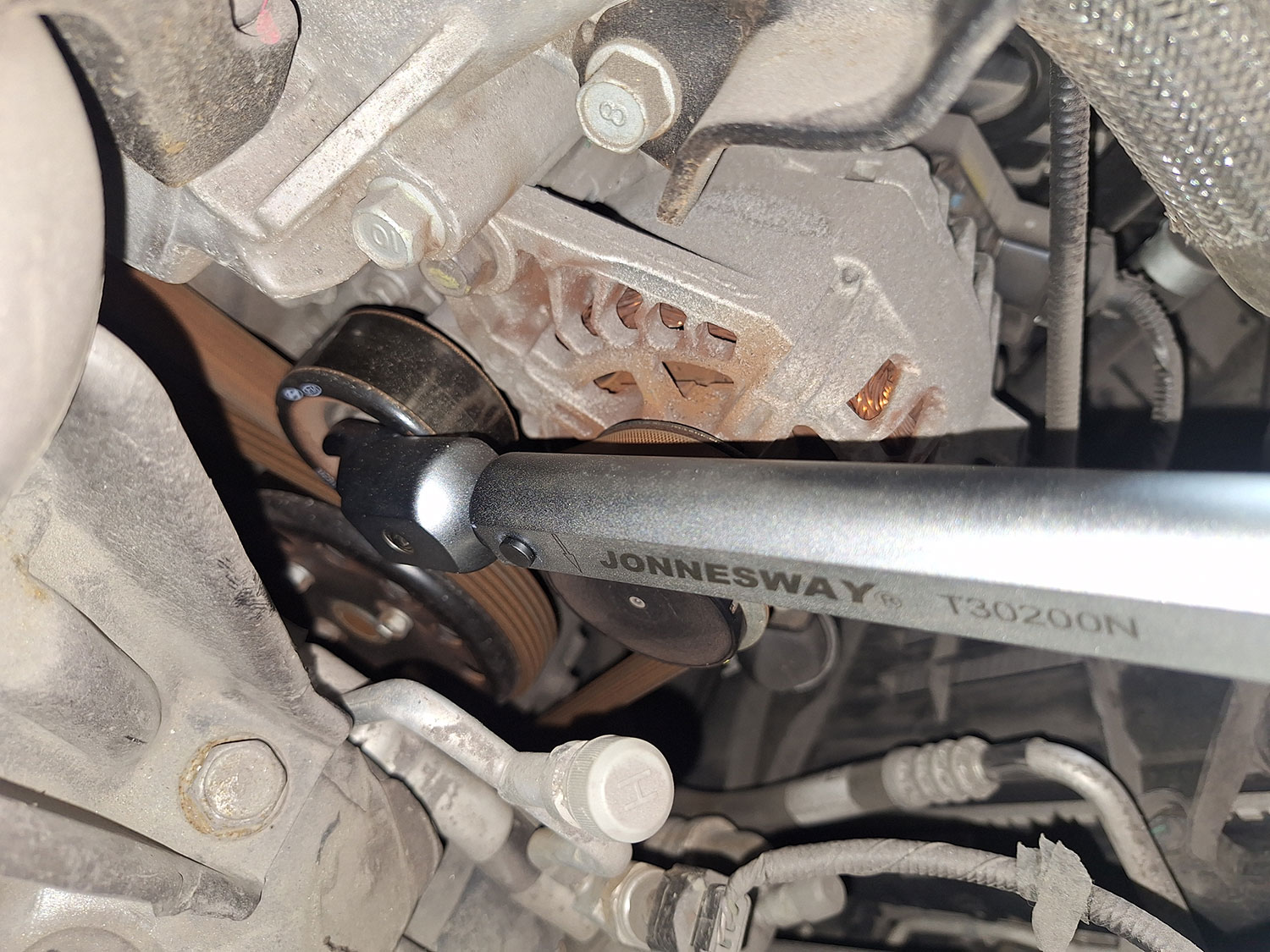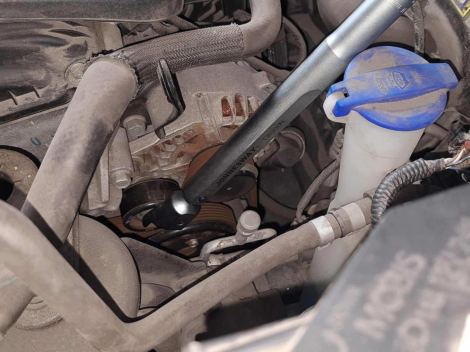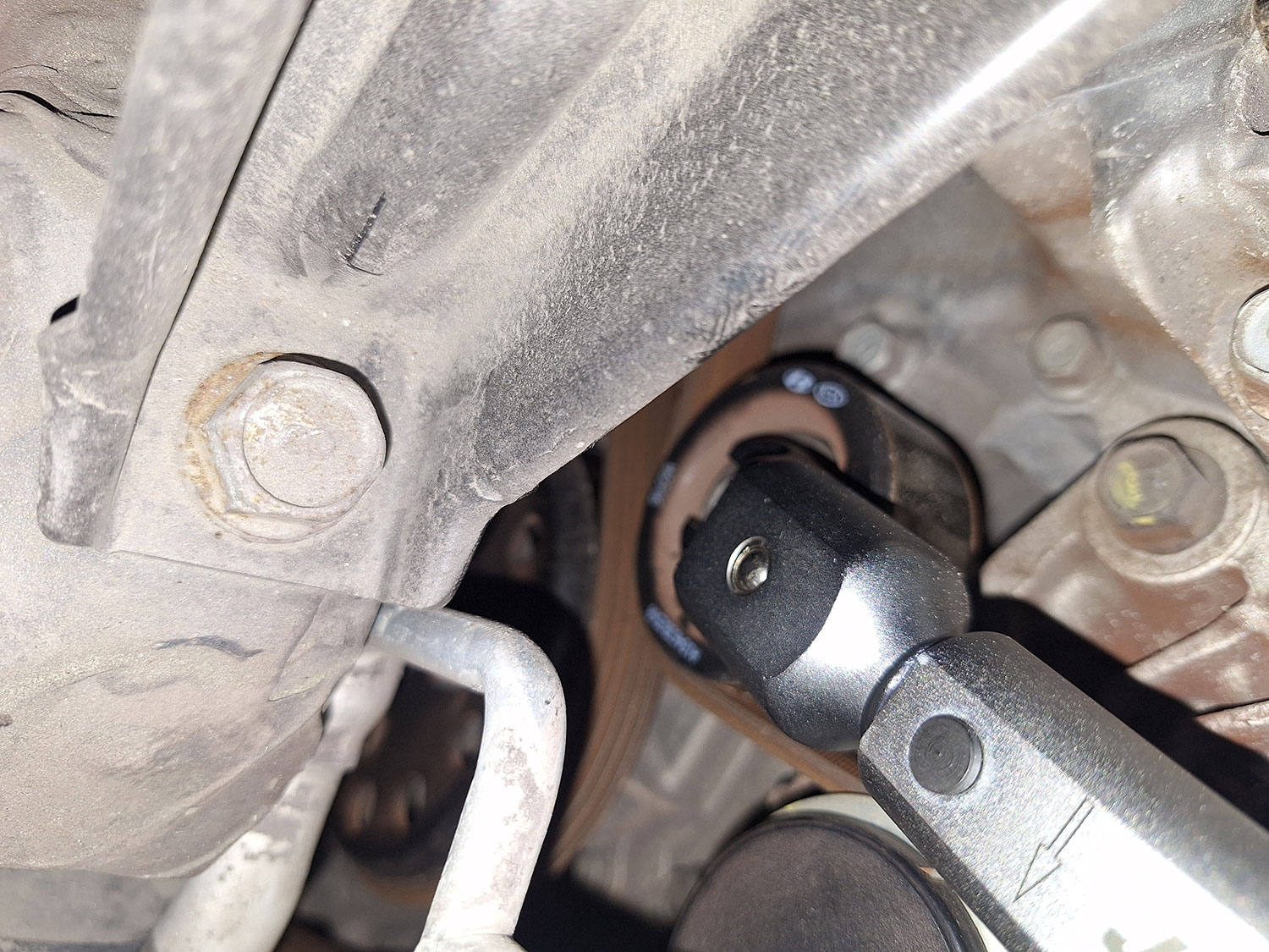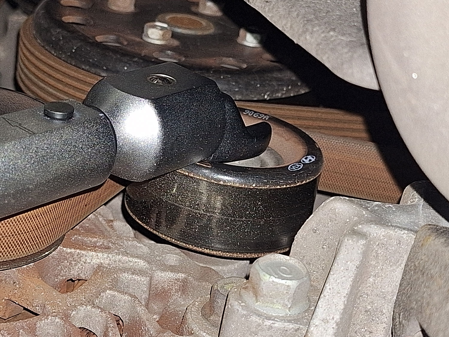 То есть, рабочая часть в большинстве случае предназначена для использования только лишь торцевых головок. В принципе, этого бывает достаточно для проведения большей части ремонтных работ, но иногда бывают случаи, когда необходимо затянуть болт или гайку с определенным моментом, но вот доступа к этому соединению для того, чтобы накинуть головку, нет. Вот, к примеру такой случай, когда нам требуется затянуть болт крепления обводного ролика на ремне привода вспомогательных агрегатов.