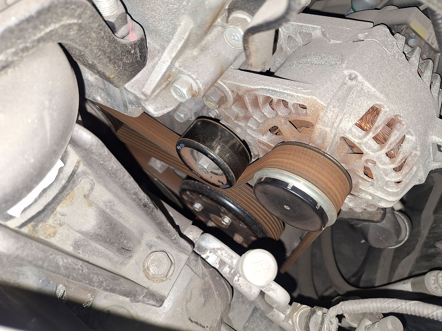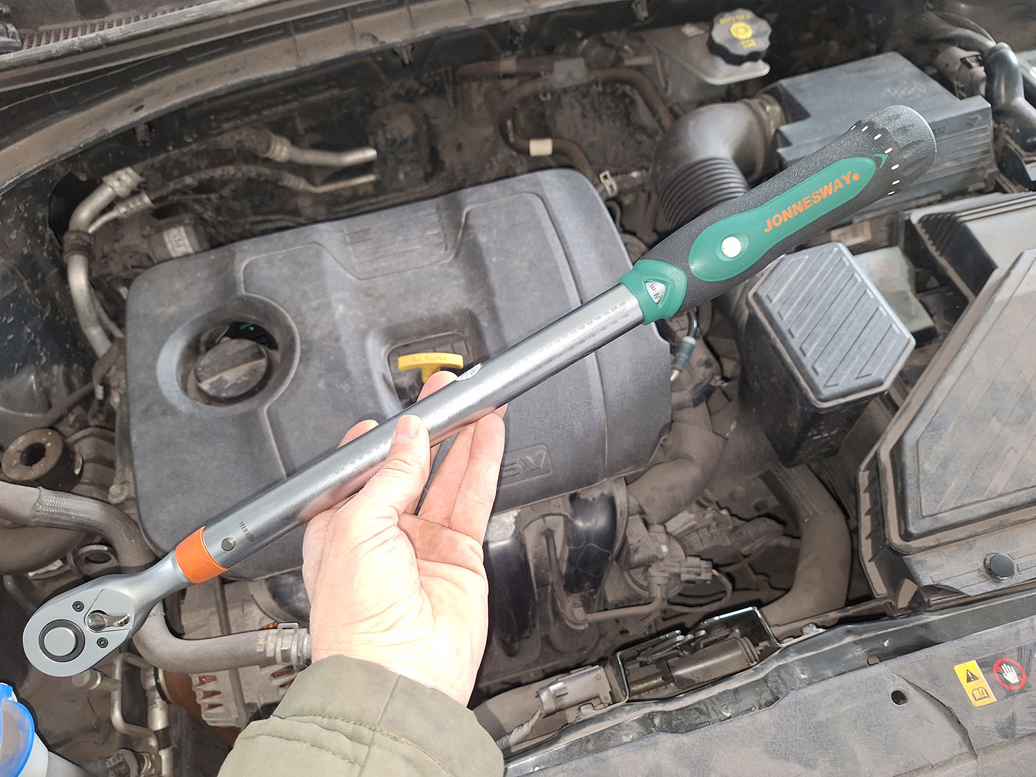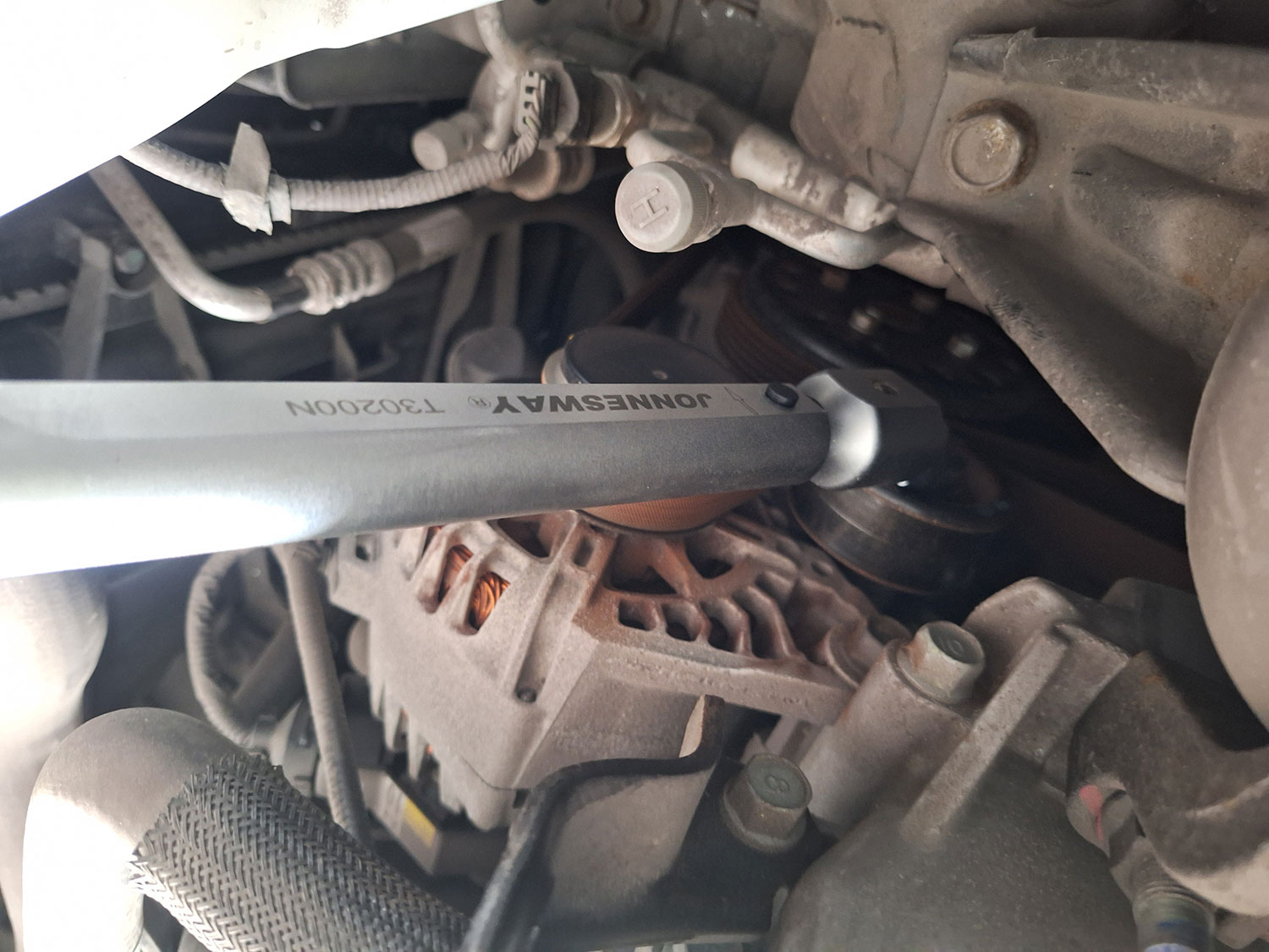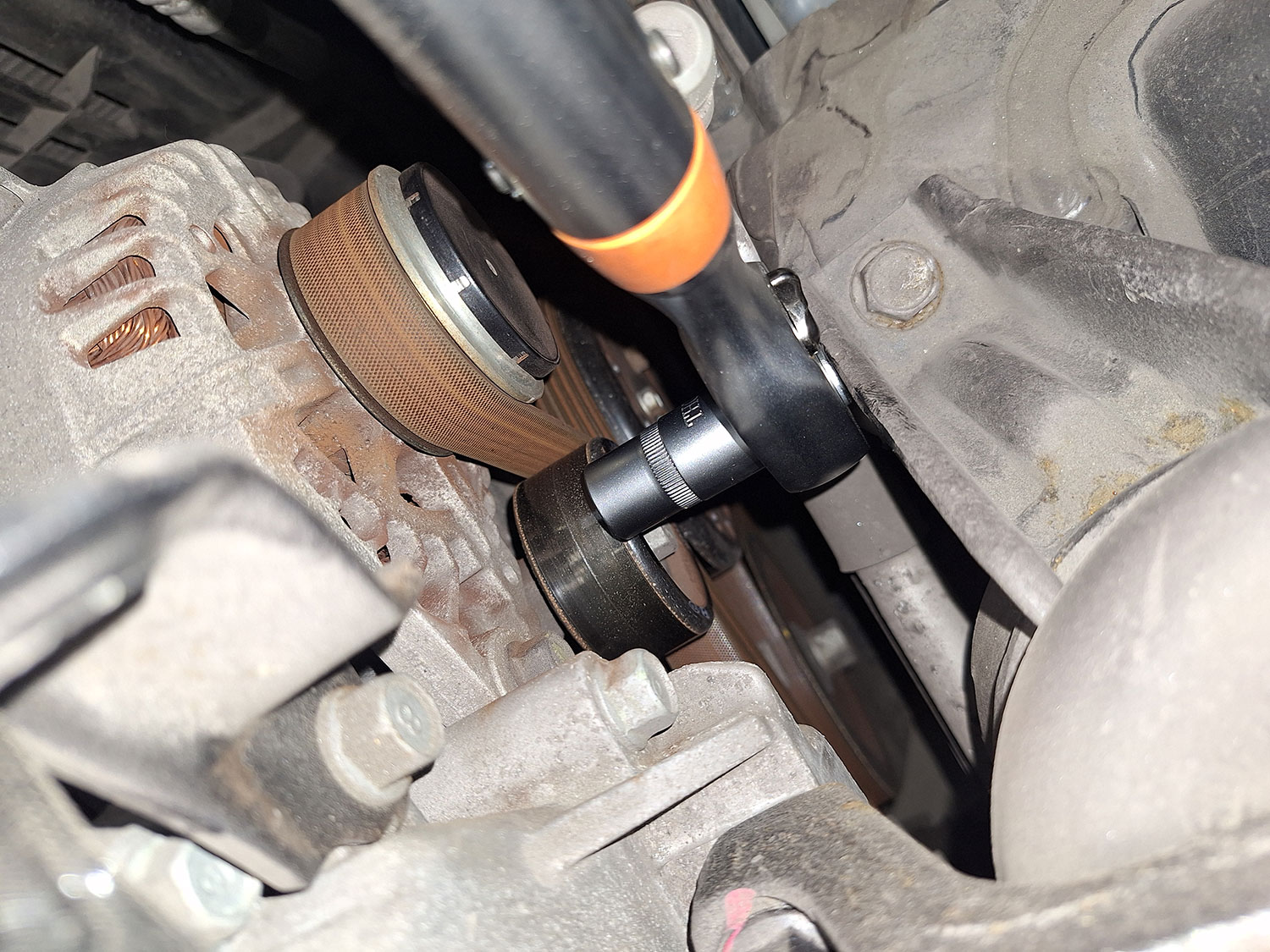То есть, рабочая часть в большинстве случае предназначена для использования только лишь торцевых головок. В принципе, этого бывает достаточно для проведения большей части ремонтных работ, но иногда бывают случаи, когда необходимо затянуть болт или гайку с определенным моментом, но вот доступа к этому соединению для того, чтобы накинуть головку, нет. Вот, к примеру такой случай, когда нам требуется затянуть болт крепления обводного ролика на ремне привода вспомогательных агрегатов.